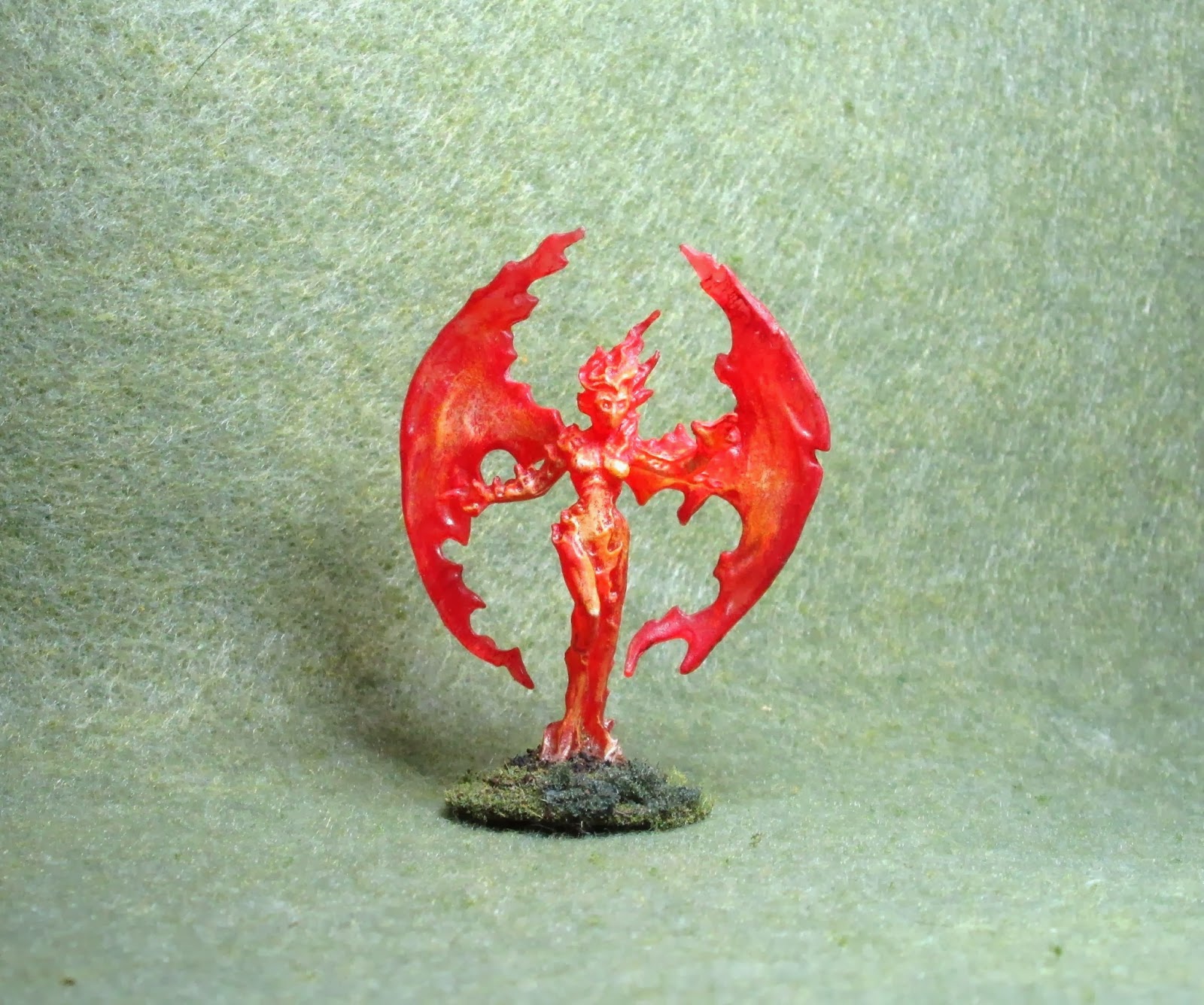 I wanted this figure to appear as if the source of its heat was coming from its core, so I wanted it to be hottest and brightest in the center and darkest and coolest as you reached the outer edges. To do this effect I had to think of the figure almost two dimensionally, and luckily the sculpt lends itself to that. I began by giving the outer edges of the figure, the wings, body, and upper arms, a drybrushing with Apple Barrel "Apple Maroon", and then just inside this, working my way towards the center, I gave it a dry brushing with GW "Blood Red"